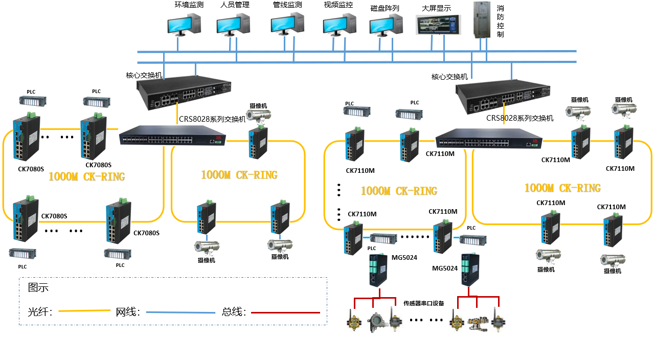 ◆ 支持多种光纤网络结构:点对点、星型、链型、环网冗余,并可组合为更复杂的网络拓扑结构支持多种网络结构需求;