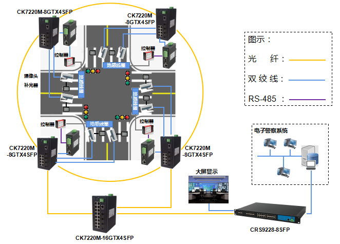 方案主要采用基于工业环网设计,在每一个道路边分控箱使用了讯记科技导轨式管理型工业以太网交换机CK7220M-8GTX4SFP,下行千兆双绞线接入现场设备,上行千兆光纤接入路口主控箱里的讯记科技导轨式全千兆工业交换机CK7220M-16GTX4SFP,所有十字路口主控箱里的汇聚到中心机房,中心机房通过讯记科技机架式全千兆三层交换机CRS9228-8SFP将数据信息传输到交通指挥中心或电子警察中心系统。